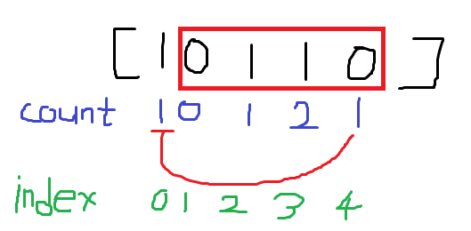 count가 같다는건 두 인덱스 사이의 0과 1의 개수가 일치한다는걸 의미합니다.