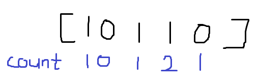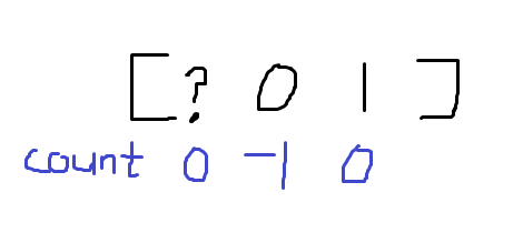배열을 순차적으로 순회하며 0이면 -1, 1이면 +1을 해주는 count 변수를 만들어줍니다.